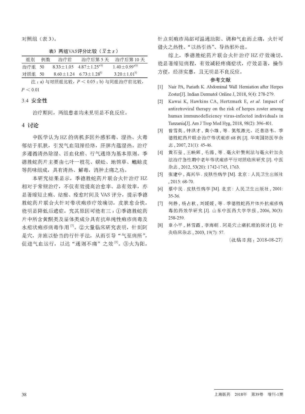 本研究观察季德胜蛇药片联合火针治疗带状疱疹的临床疗效。对照组给予基础抗病毒和营养神经治疗,治疗组在对照组治疗基础上同时给予季德胜蛇药片外敷联合火针点刺治疗。治疗10天。结果显示:治疗组临床疗效显著优于对照组;治疗组止疱、结痂、痊愈时间均显著短于对照组;治疗组疼痛评分较治疗前显著降低,且显著低于对照组。结果表明季德胜蛇药片联合火针治疗带状疱疹疗效确切,皮肤愈合快,能明显降低后遗症。