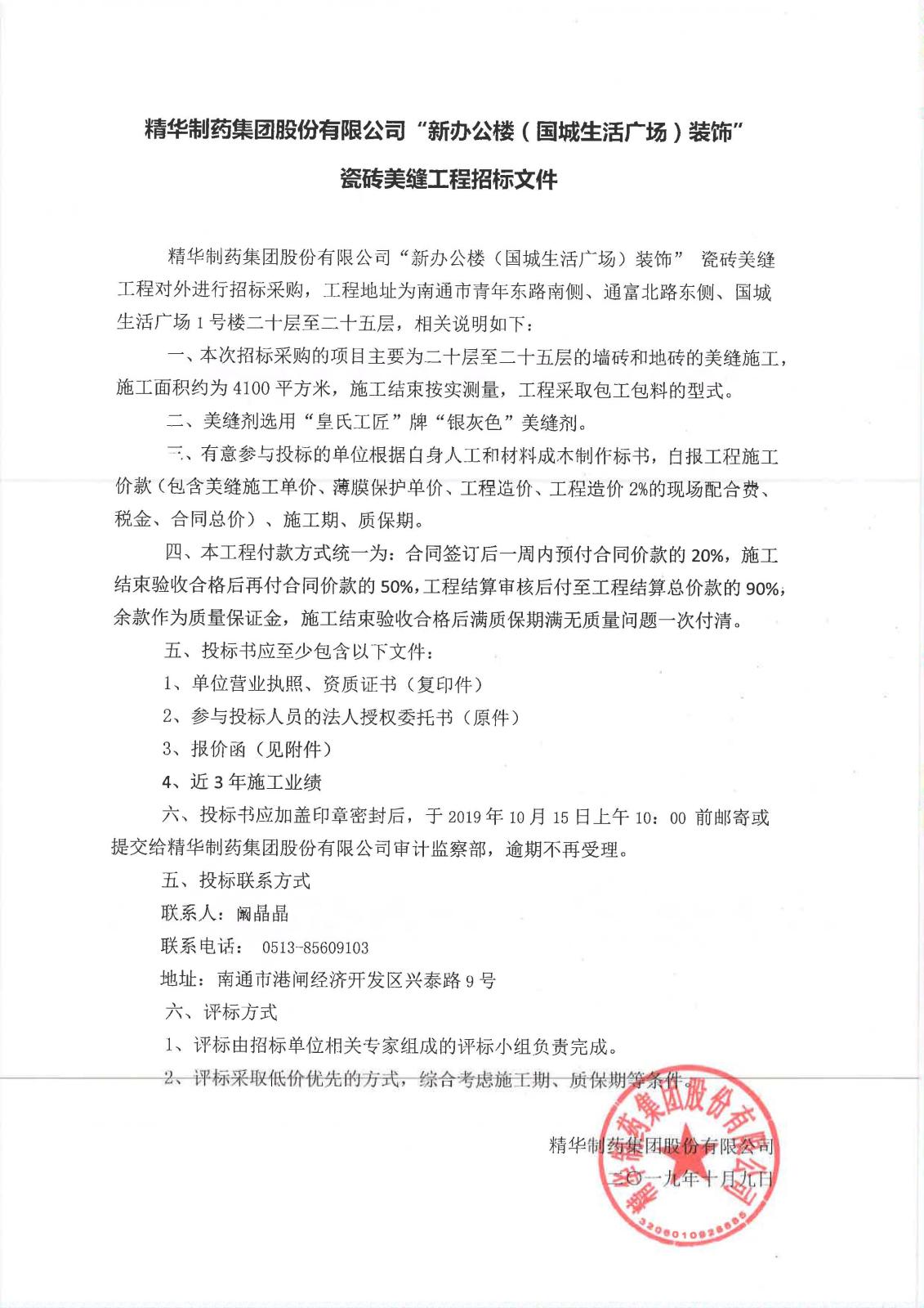 "新办公楼(国城生活广场)装饰"瓷砖美缝工程招标